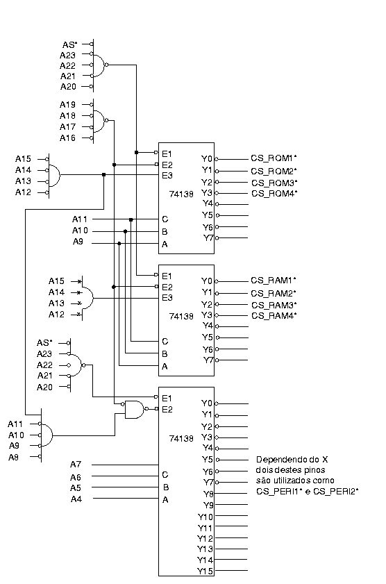 Devemos mapear os 4 blocos de memória ROM, 4 blocos de memória RAM e os dois periféricos de 16 Bytes ( = 24, endereçáveis por 4 linhas) no espaço de memória de 68000 que vai de 00 0000H até FF FFFFH, procurando utilizar como endereço inicial de cada bloco um múltiplo do seu tamanho para facilitar o projeto de decodificador.