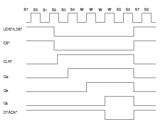 Enquanto CS*=1, CLR*=0 e todos os pinos de saída do registrador, QaQbQcQdQeQfQgQh, assumem o valor 0. No estado S2, quando UDS*/LDS*=0 (quando se inicia o acesso váido de memória), CS* que os segue também assume o valor lógico 0 e CLR*=1. Como A=B=1, então o valor lógico 1 é deslocado de Qa para Qh a cada pulso de relógio. No caso DTACK*=NOT(Qc), então após dois ciclos de relógio, Qc=1 e DTACK*=0. Segue-se então a desativação de UDS*/LDS* e CS*. Como resultado, CLR* volta a ser 0 e todas as saídas passam a ser 0 novamente.