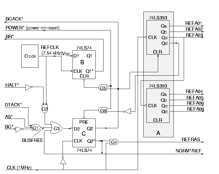 Seja o seguinte circuito de regeneração de DRAMs operando no modo RAS*-only para um processador 68000.