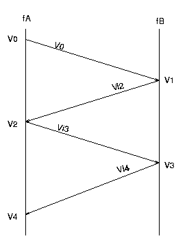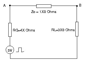 Um pulso inicial que se propaga pelo barramento tem o potencial V0 = 5V x 1X0/(4X+1X0). Este pulso, ao incidir no ponto B, é refletido com um valor igual a fB x Vi1. Portanto, no instante tp o potencial no ponto B é V1 = tensão nos instantes anteriores + (1 + fB) x Vi1 = 0 + (1 + fB) x V0. O pulso refletido no instante tp (no ponto B), Vi2 = fB x Vi1, se propaga ao longo do barramento e atinge o ponto A no instante 2tp, onde é refletido novamente. Assim, a tensão no ponto A no instante 2tp é V2 = tensão nos instantes anteriores + (1 + fA) x Vi2 = V0 + (1 + fA) x Vi2. O pulso refletido, Vi3 = fA x Vi2, se propaga e atinge o ponto B, onde é refletido novamente no instante 3tp. Com isso, a tensão no ponto B passa a ser V3 = V1 + (1 + fB) x Vi3. E finalmente, o pulso de tensão igual a Vi4= fB x Vi3 se propaga ao longo do barramento e atinge o ponto A onde é refletido de forma que a tensão neste ponto no instante 4tp passa a ser V4 = V2 + (1 + fA) x Vi4. A figura seguinte sintetiza esta idéia.