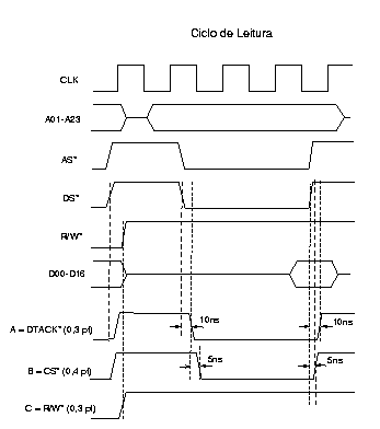 (1.0 pt) (a)Esboce, com uso do diagrama de tempos, os sinais A, B e C em função dos sinais CLK, A01-A23, AS*,(L,U)DS* e R/W* no ciclo de leitura, indicando os valores dos tempos envolvidos com estes 3 sinais.