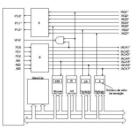 No caso dos processadores da família MC68000, a distinção entre uma interrupção vetorizada e uma interrupção auto-vetorizada se dá pela ativação ou não do sinal VPA* durante o processamento de uma interrupção. No circuito em questão, as requisições oriundas dos dispositivos Mouse, Teclado e Relógio geram interrupções vetorizadas, porque o sinal VPA* não é ativado.