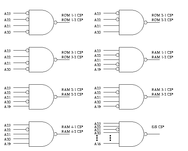 Sua proposta deve conter (a) o mapa de memória, (b) o número de chips necessários de cada tipo, (c) a tabela de decodificação de endereços e (d) os circuitos lógicos para a geração do sinal Chip Select* (CS*) de cada chip utilizado na memória ou na entrada/saída. Use a decodificação completa (sem espelhamento).