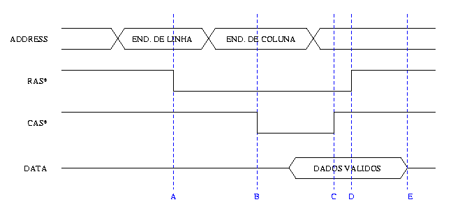 O ciclo se inicia com a colocação do endereço de linha desejado no barramento de endereços da memória. Isto normalmente é feito por um multiplexador que seleciona alguns bits do barramento de endereços do processador. Em seguida, um sinal RAS* (Row Address Strobe), gerado por um circuito de controle a partir de AS*, DS*, R/W* e dos bits mais significativos do endereço, é ativado fazendo com que a DRAM leia o endereço de linha disponibilizado (instante A na figura). Após um período de tempo definido pelo circuito de controle, é colocado no mesmo barramento de end. da memória o end. da coluna desejada (também via multiplexador). Logo a seguir é preciso que o sinal CAS* (Column Address Strobe) seja ativado pelo circuito de controle para fazer com que a DRAM leia o end. de coluna (instante B). Feita a leitura deste end. de coluna, basta aguardar um certo tempo (determinado pelo fabricante da memória) até que o barramento de dados saia do estado de alta impedância e se possa ler com segurança os dados apresentados lá. Em seguida, os sinais CAS* e RAS* são negados (instantes C e D), o que força o barramento de dados da memória a entrar novamente no estado de alta impedância (instante E).