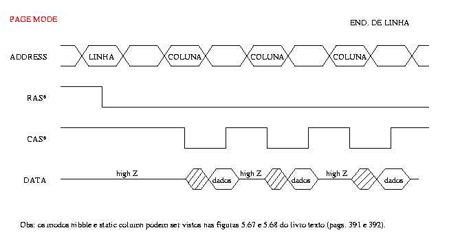 Uma memória DRAM pode trabalhar em diferentes modos de operação, tais como modo paginado (page mode), modo de coluna estático (static column mode) e modo nibble. Explique detalhadamente o funcionamento de um destes modos, ilustrando sua explicação com um diagrama de tempos.