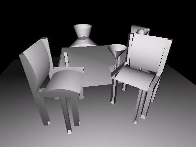 Observe que a transição entre a parte iluminada pela fonte de luz pontual para a parte iluminada pela luz spot apresenta um efeito de serrilhado. Modifique o refinamento da malha que define o chão e o tampo da mesa e observe como esse efeito depende da resolução da grade. Observe também que a luz spot ilumina incorretamente a parte do chão que está embaixo da mesa. Por que ocorre esse efeito? O que poderia ser feito para consertar esse problema?