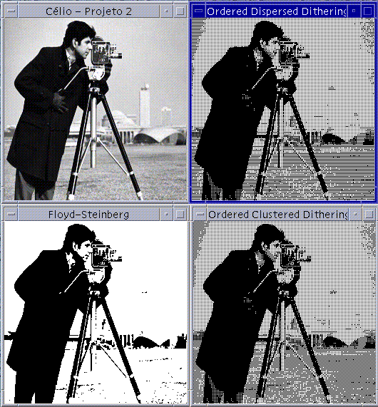 O funcionamento do aplicativo é simples, digita-se o nome do programa seguido da imagem (em formato PGM). Será exibida a imagem original. O usuário poderá exibir quaisquer uma das técnicas utilizadas, bastando pressionar os botões 1, 2 ou 3. Para sair, pressionar a tecla ESC. |
