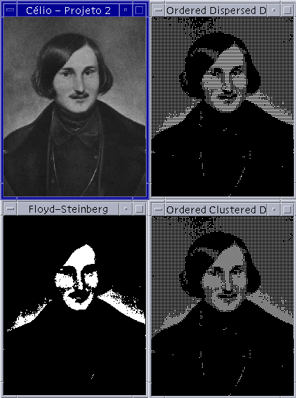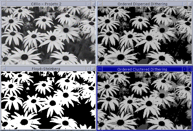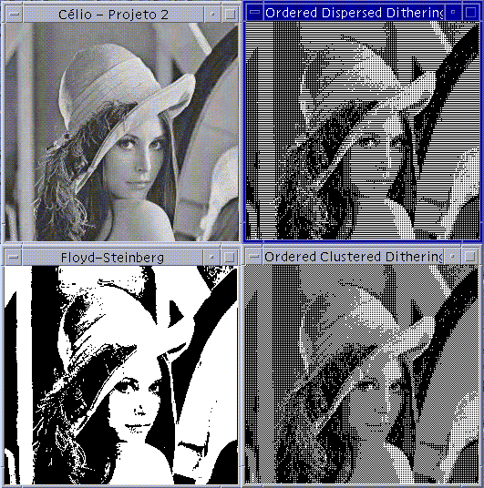 | O principal objetivo deste projeto é apresentar técnicas de quantização de imagens em tons de cinza utilizando apenas duas intensidades, o preto e o branco. Utilizou-se a biblioteca gráfica OpenGL e a linguagem C. Foram utilizadas imagens no formato PGM para este propósito. |